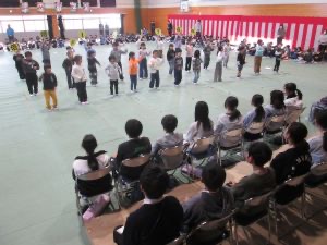 6年生は1年生からメダルのプレゼントをもらい、入場です。